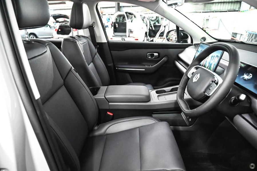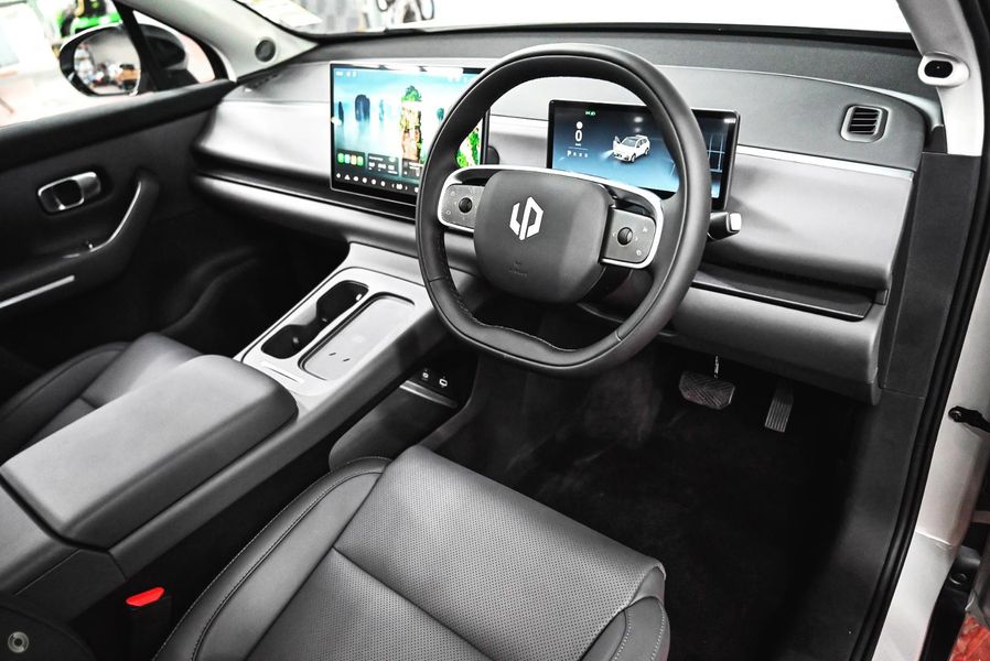 The cabin features a 14....6-inchmultimedia touchscreen, synthetic leather trim, panoramic sunroof, and fold-flat front seats for camping mode.